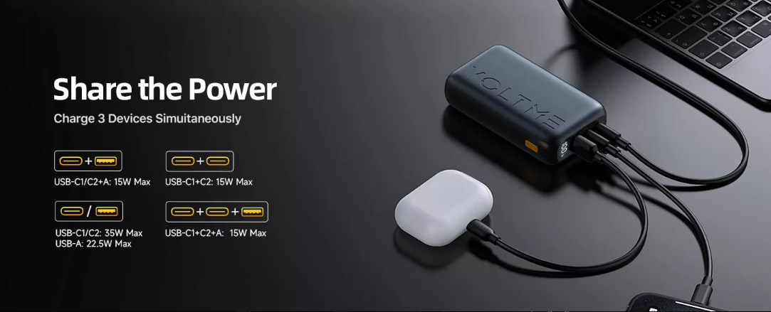 Công suất lớn 35W: pin dự phòng cung cấp khả năng sạc nhanh và hiệu quả cho nhiều thiết bị ( điện thoại, máy tính bảng, laptop,...); hoặc sạc đồng thời ba thiết bị